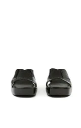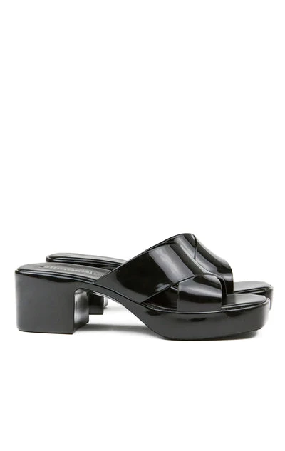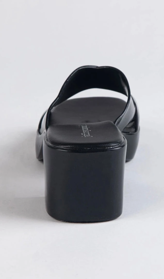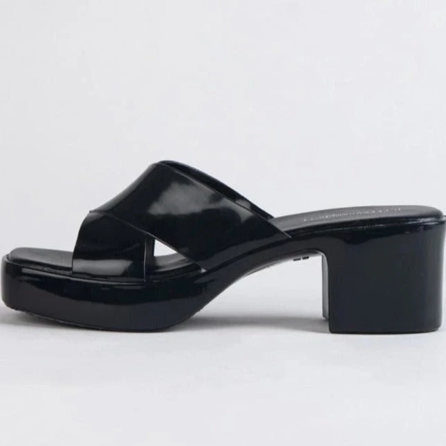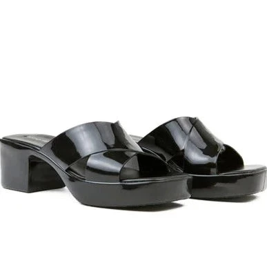 Square toe platform jelly sandal with cross band straps.