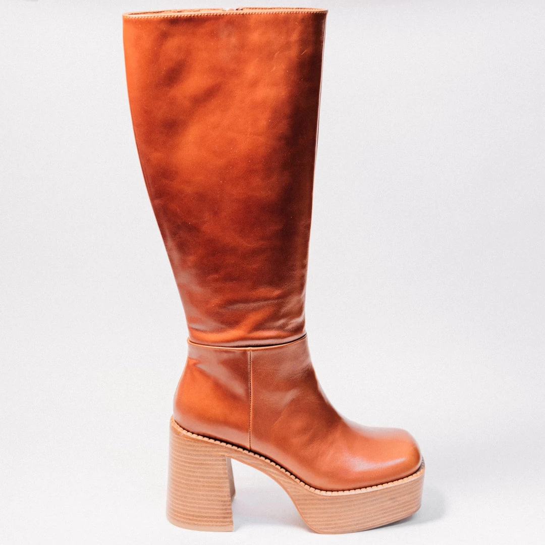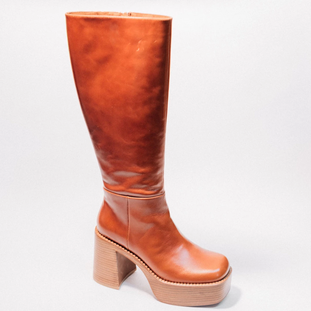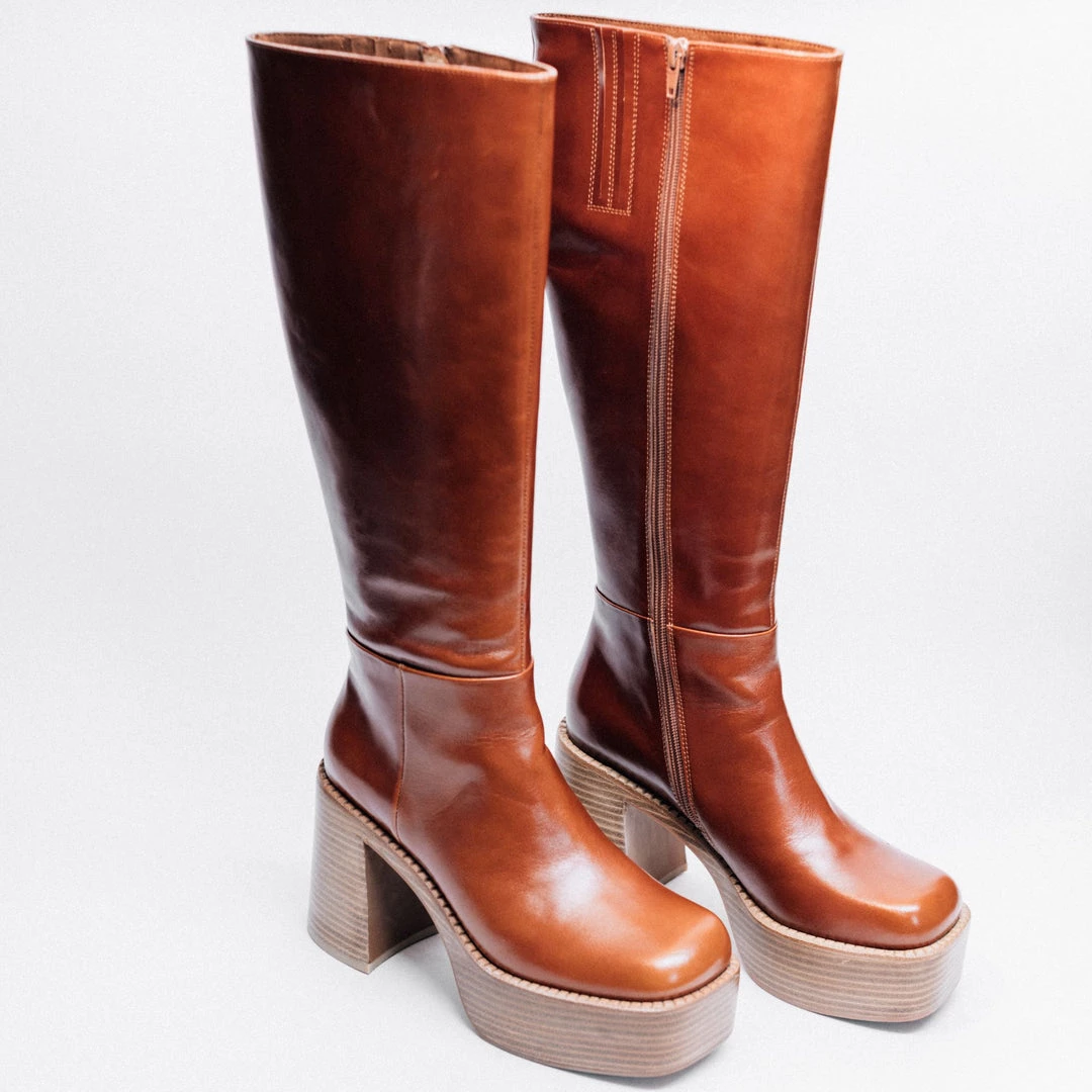 Knee-high platform boot with square toe.