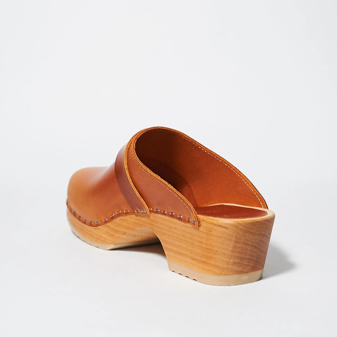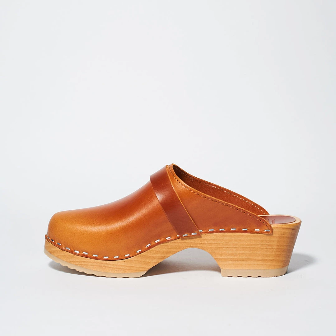 Berkeley is a classic clog with clean Scandinavian design. The clogs come in a rich cognac pull up leather with a beautiful two tone effect. The clogs are made on our varnished comfy bottoms which make them great for many different weather conditions.