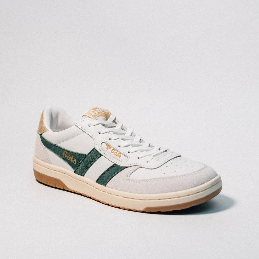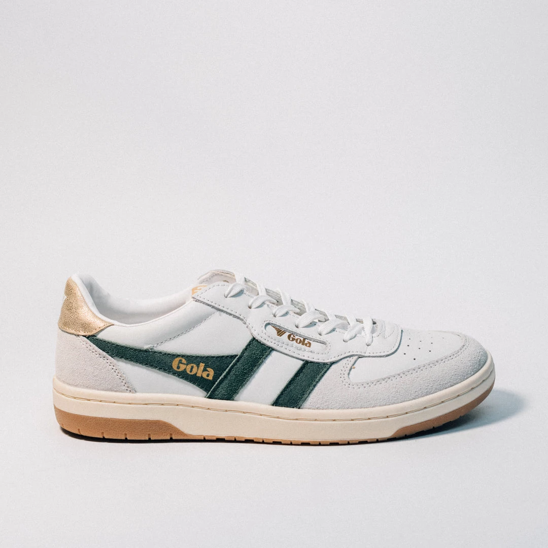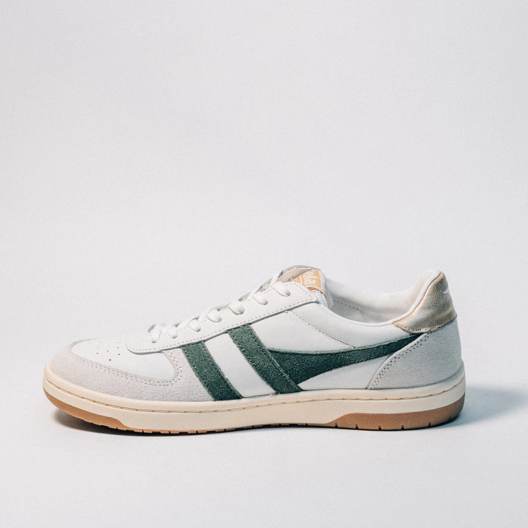 A new addition to the Gola Classics collection, Hawk is court-sport inspired. This timeless sneaker silhouette for women comes in a combination of leather, suede and mesh in white/dark green/gold and is complemented with a two colour cup sole, the understated combination translates as a ‘relaxed ‘80s’ sneaker giving an easy old skool vibe. Wear with loose denim or your fave midi skirt.