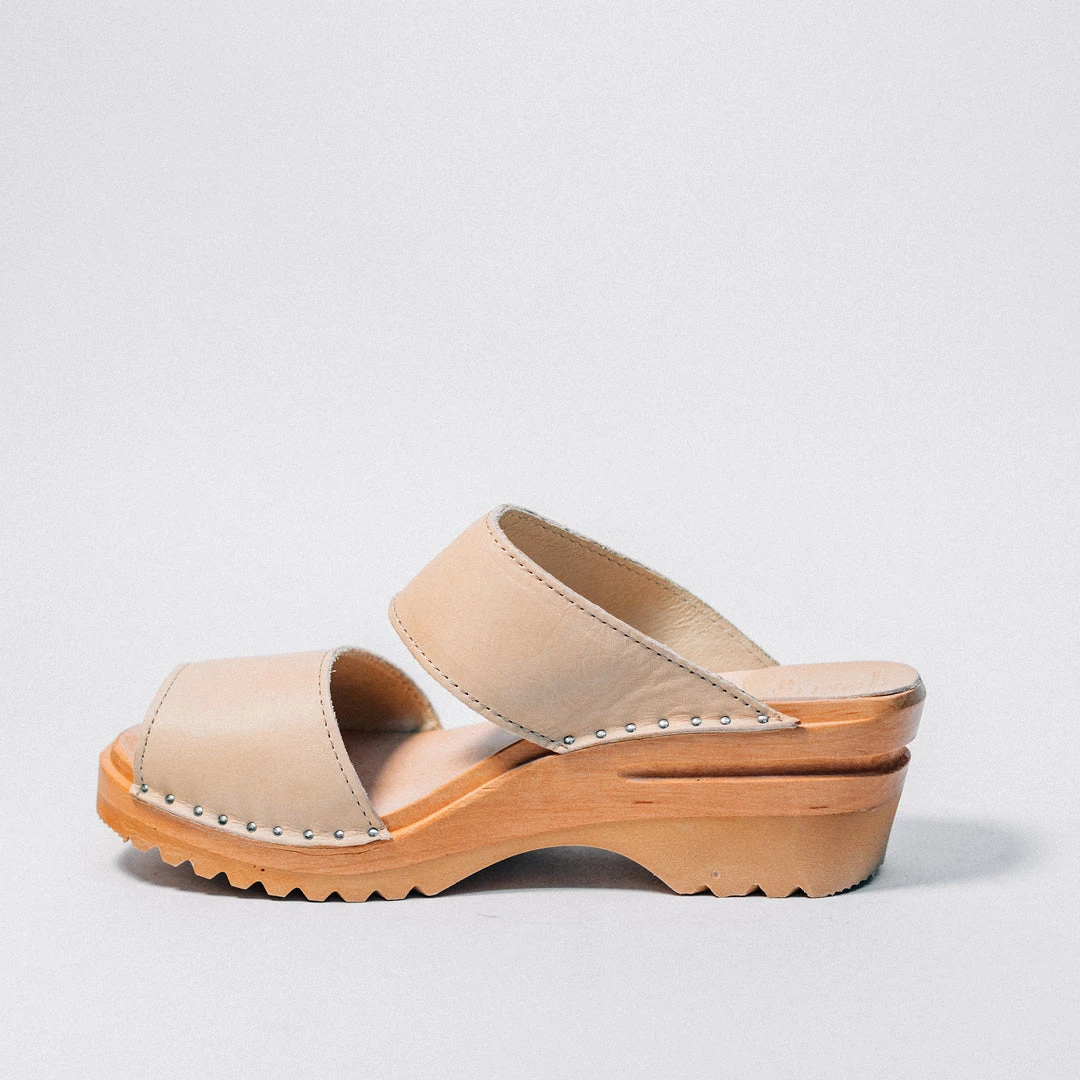 Clog sandal in light tan leather. Karin has a clean design with two straps over the instep and are made on our varnished Ideal bottoms.