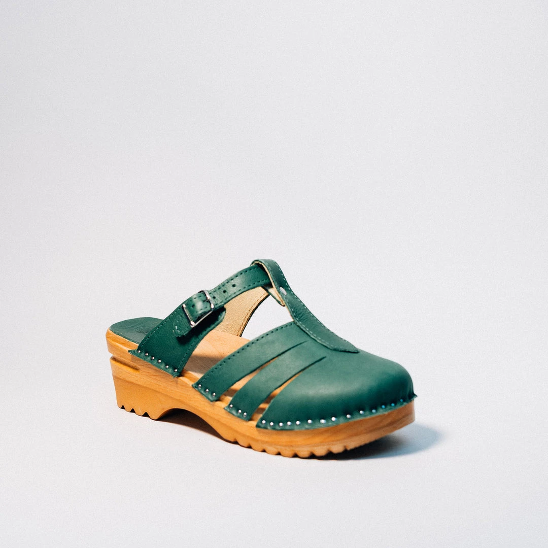 Clog Sandal with airy closed toe design in turquoise vegetable tanned leather. This leather will age with a beautiful rich patina, giving a distinctive look to every pair of clogs. A protective coating has been applied to make it less sensitive, but as with all vegetable tanned leathers, it is best to to try and avoid exposure to water and other liquids.