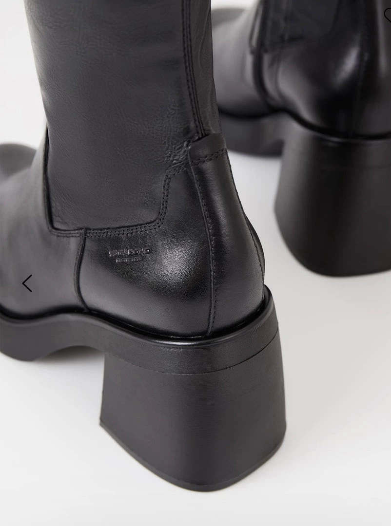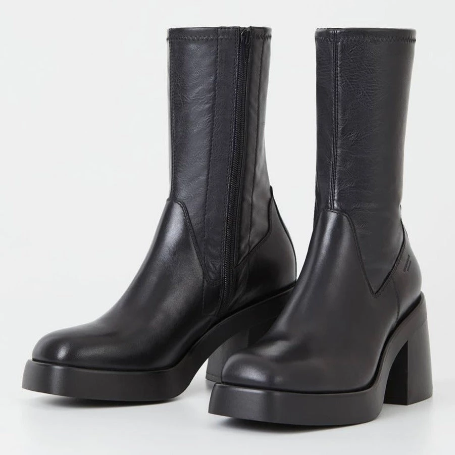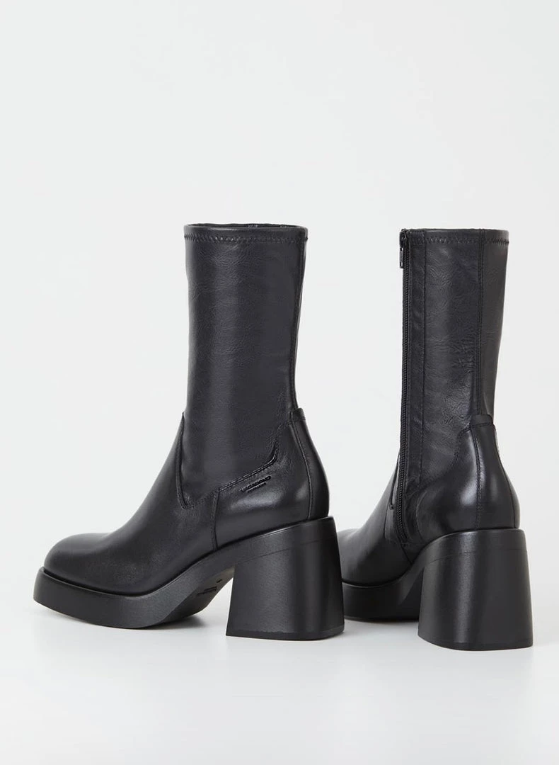 Modern chunky boots Brooke is crafted in a stretchy leather/combination material. The mid-rise style sets on solid platform outsoles with 85 mm block heels. Details include square toes and inside zippers.