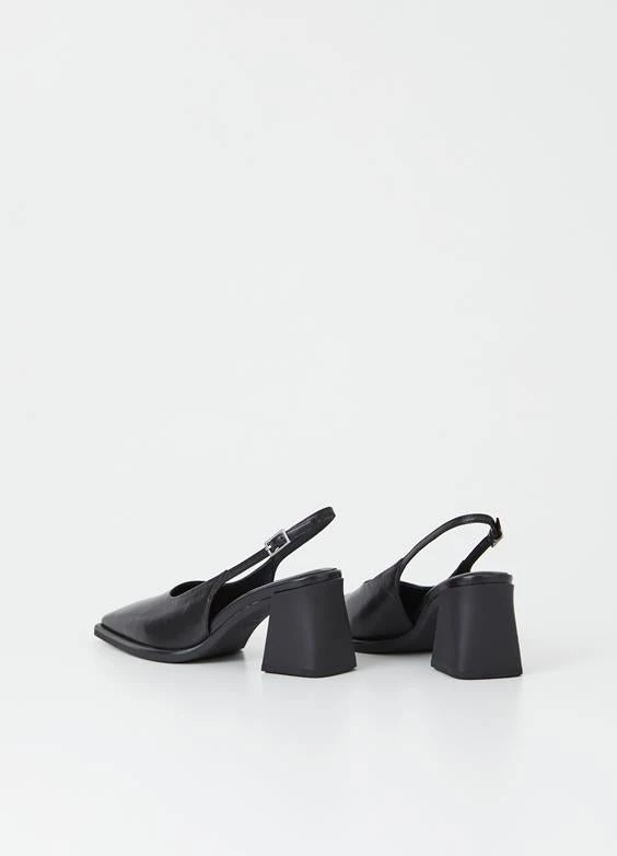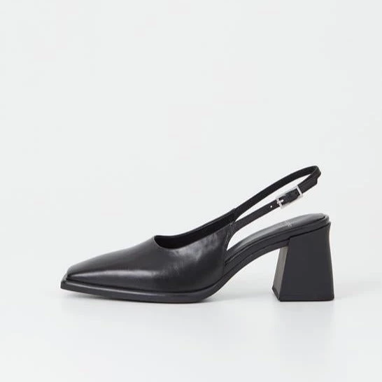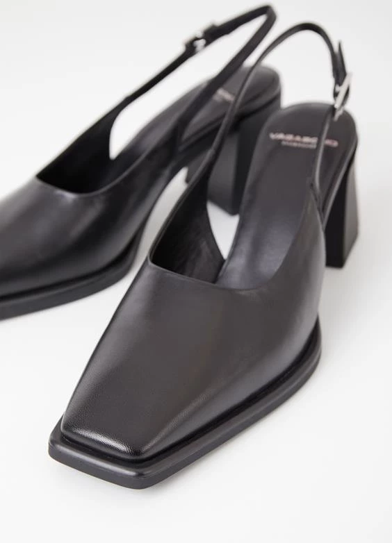 Hedda is the modern slingback sandals with a subtle retro vibe. The style is crafted in black leather, featuring sharp square toes, slingback-detail and an adjustable buckle strap. The flared block heels measure 70mm.