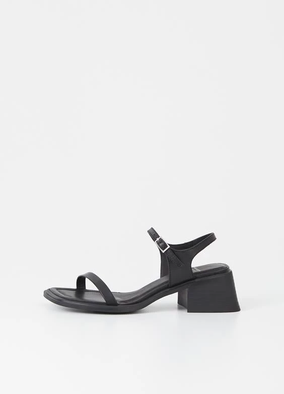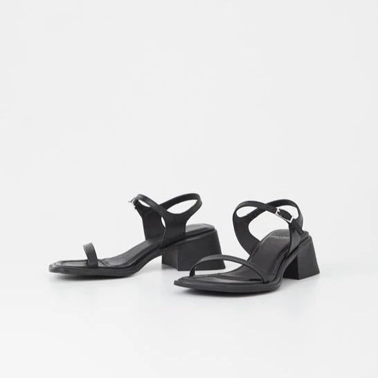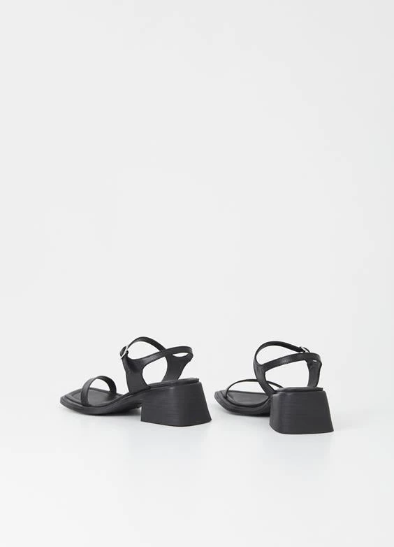 Ines is the modern mid-heel sandal with a pared-down aestetic. The style is crafted in black leather with thin leather straps, adjustable ankle strap and subtle square toes. The style sets on thin outsoles and 53mm flared heels.