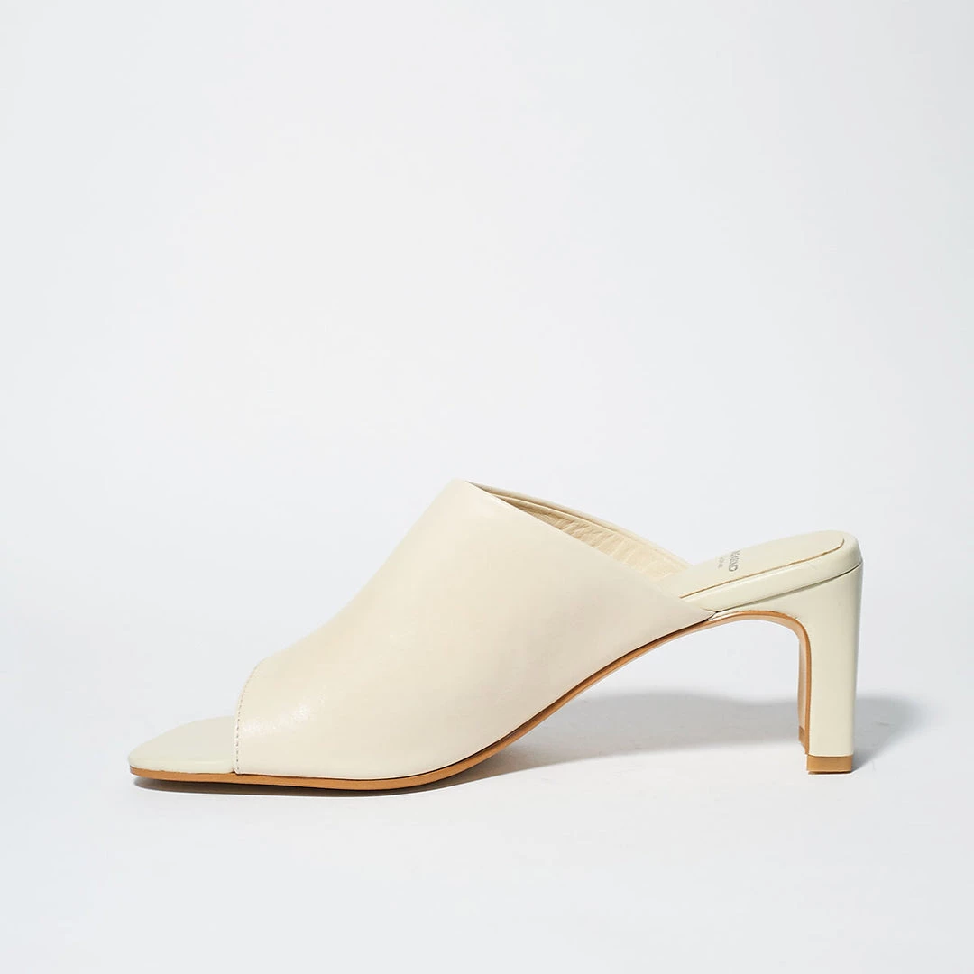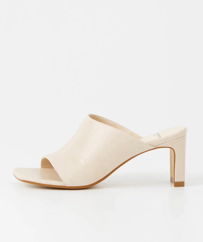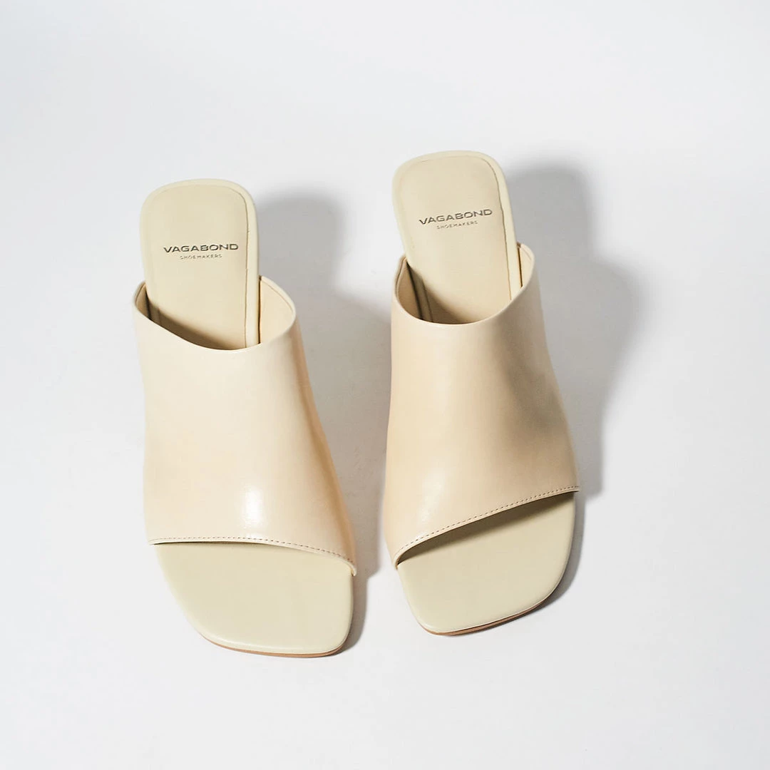 A slender, rectangular heel lifts a sleek slide sandal crafted from smooth, supple leather and finished with a square toe.