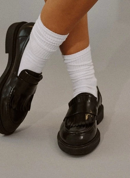 Add the perfect polished elegance to your shoe edit with the Alex loafers. Set on solid rubber soles, they’re crafted in a polished black leather upper, detailed with decorative fringes across the vamp. Other features include raised seams, almond-shaped toes and visible stitching along the outsole. The flexible rubber soles measure 33mm for a subtle lift.