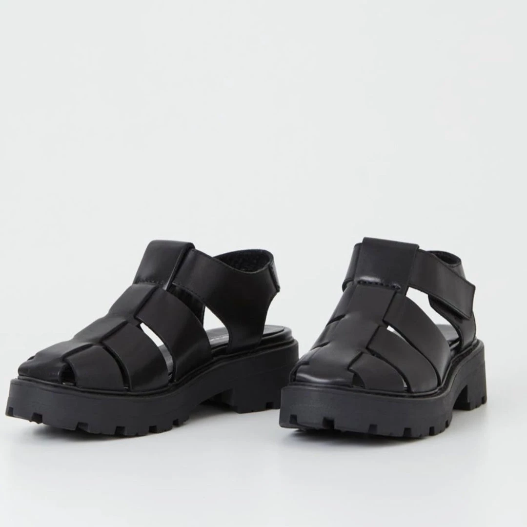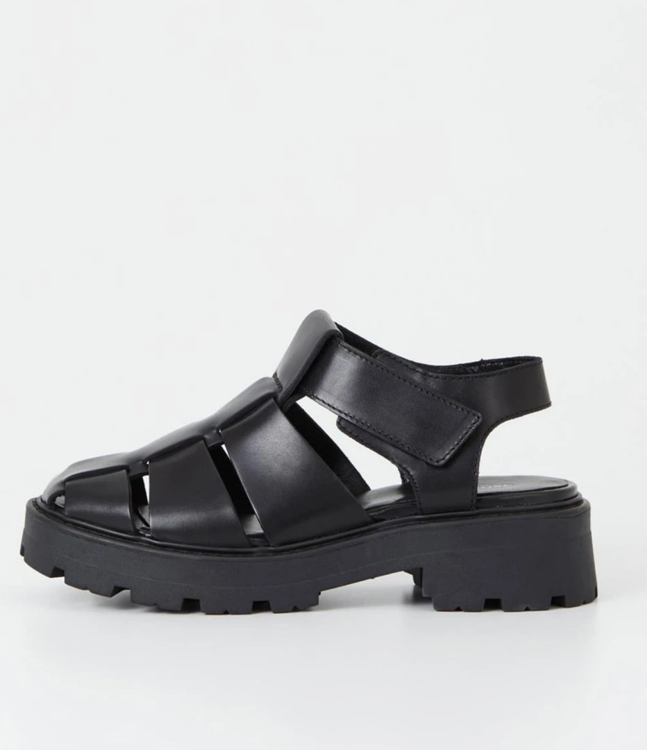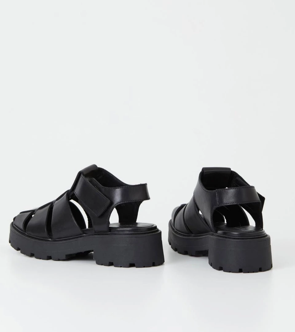 Cosmo 2.0 is the chunky fisherman sandals crafted in black leather featuring rounded toes, open heels and hook-and-loop fastening. The solid rubber outsoles measure 45mm.