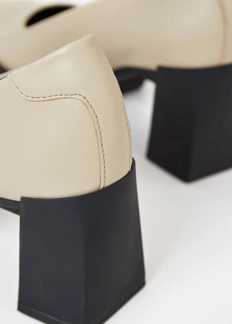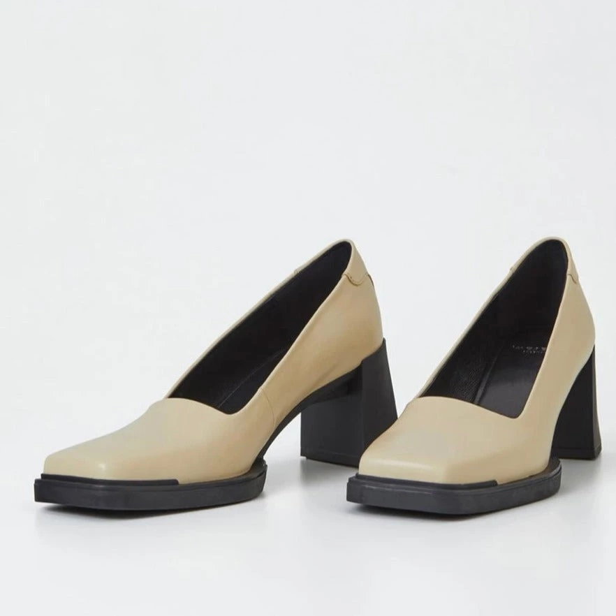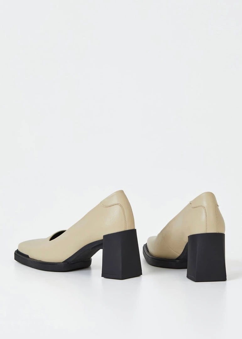 Edwina is crafted from smooth BISCOTTI leather, detailed with sharp square toes and a retro-inspired upper. The sculptural style sets on 2.91” distinct block heels for a subtle lift.