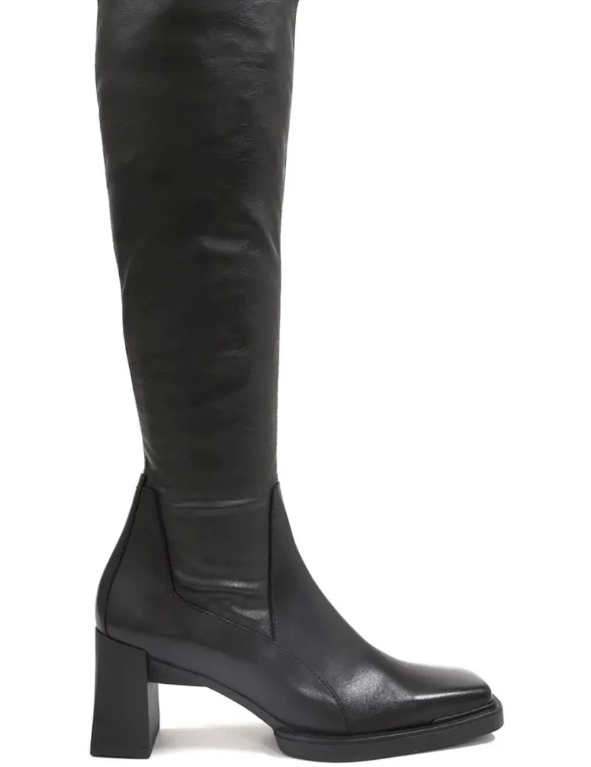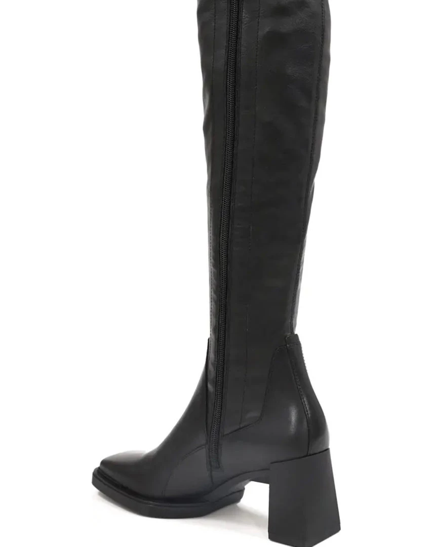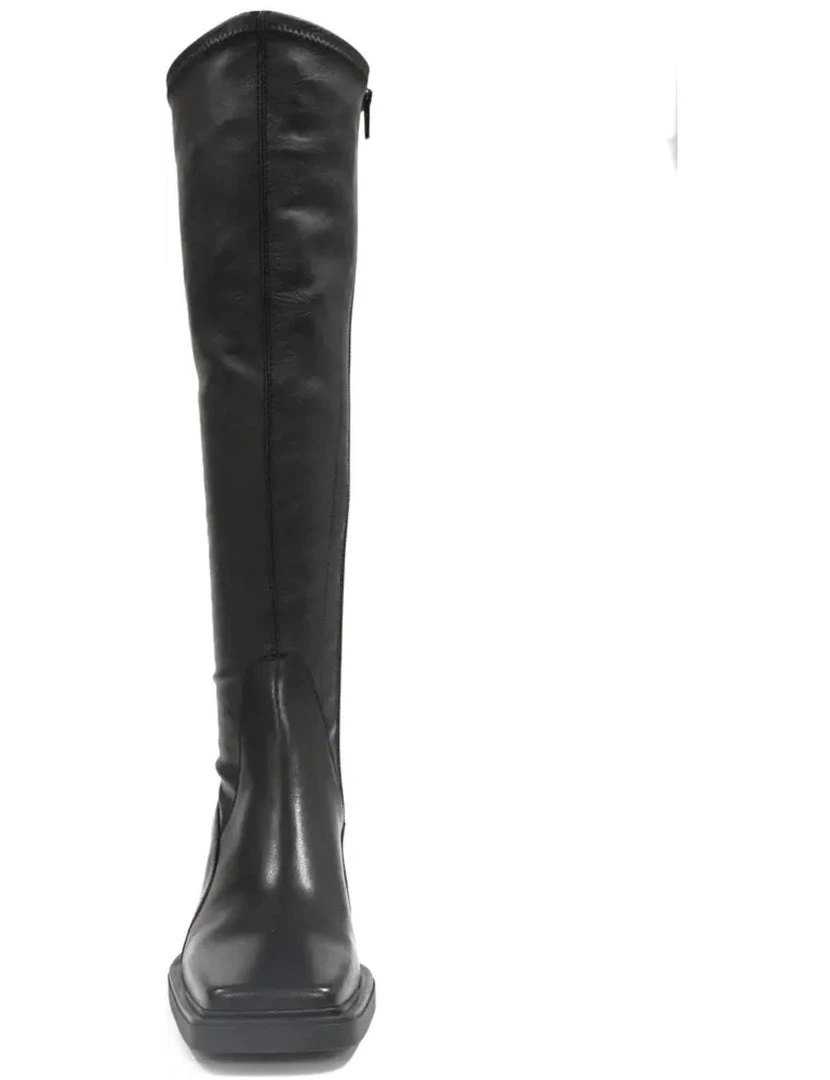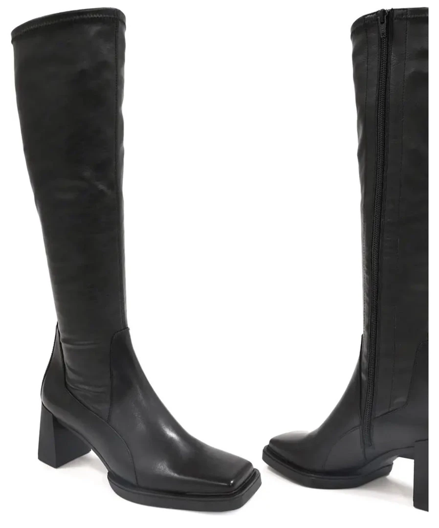 A square toe and block heel enhance the angular, modern style of a knee-high boot with a stretchy shaft to provide an impeccable fit.