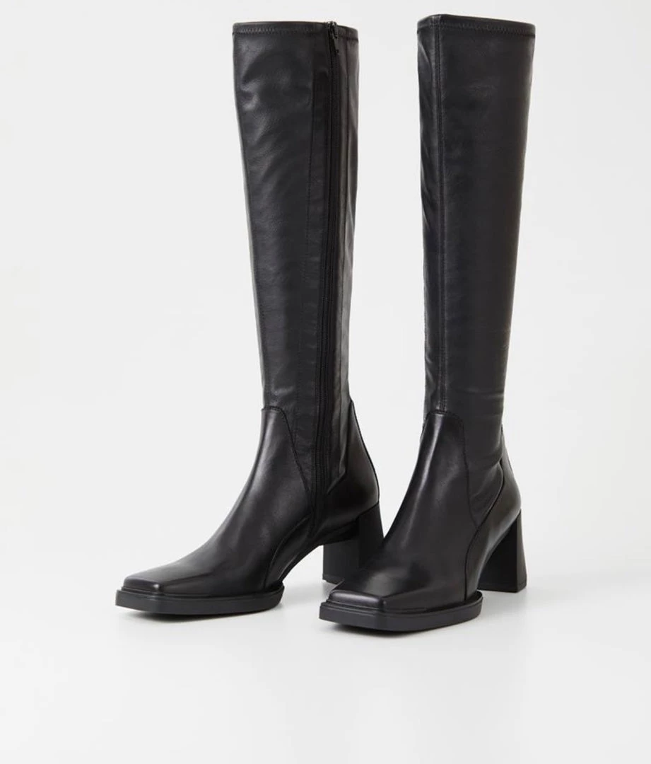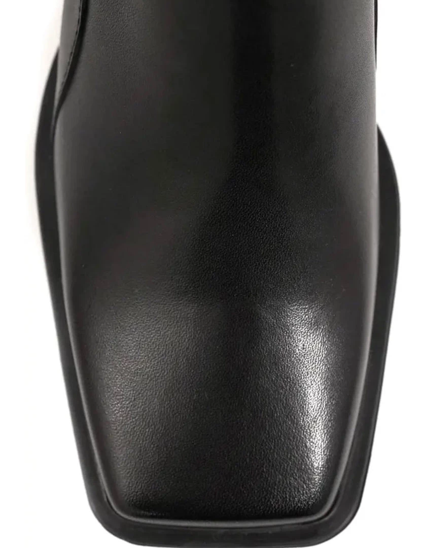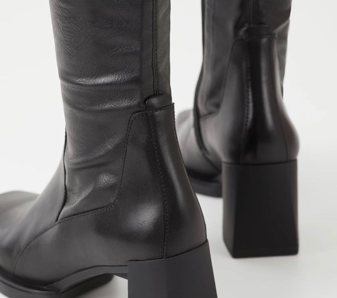 A square toe and block heel enhance the angular, modern style of a knee-high boot with a stretchy shaft to provide an impeccable fit.